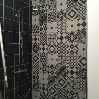 Armée de plombiers présente toute la journée, du coup plan en bambou fixé dans la salle de bain avec la vasque et le mitigeur opérationnels ainsi que le mitigeur de la baignoire, petit mari y avait peint cette nuit le plafond et un mur, le meuble sous la vasque est monté, reste plus qu'à le fixer. Pour notre salle de douche, mise en place d'un premier meuble et plan avec vasque et mitigeur installé, ainsi que la colonne de douche. Petit mari avait peint cette nuit plafonds et murs. Par contre les plombiers reviennent demain avec une mèche spéciale pour trouer notre super carrelage trop résistant pour fixer la paroi de douche. Tous les wc sont installés fixés avec abattant et opérationnels. Tous les joints d'étanchéité des salles d'eau sont faits. Pour la cuisine l'évier et son mitigeur sont installés et branchés, il ne reste plus qu'à fixer les meubles bas et le plan de travail. Tous les tiroirs sont quasiment montés. Grosse prise de tête sur le tiroir à poubelle sous l'évier (😠😡). Dans le salon une première couche de noir sur le mur "tv". Et le coffrage dans l'entrée pour le tableau électrique est fait. Coup de peinture dans la cuisine et la salle de bain ce soir. Les choses s'accélèrent...