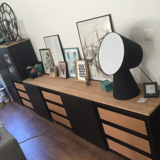 Dans le salon, le meuble Besta d'Ikea que l'on avait, s'est transformé. Les tiroirs à Dvd se sont parés de liège et leur cadre bombé en noir mat. Au lieu de réinstaller les glissières et les 4 portes coulissantes, nous avons réinstallé seulement 3 en battante. Petit rappel de liège sur les portes du dessus.